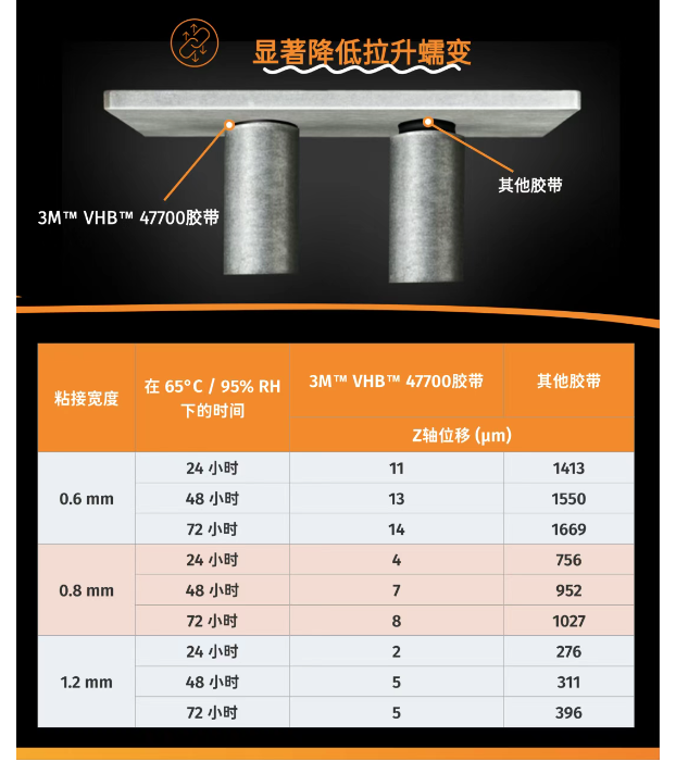 与3M™ VHB™ 4914胶带相比,3M™ VHB™ 47700胶带的抗蠕变性能提升30%。这确保设备即使在高温或高湿等挑战性条件下,也能长期保持其形状和功能。拉伸蠕变测试结果证明了该胶带在长时间内保持结构完整性的能力。 通俗理解:当设备长期处于高温环境(如夏季车内)或持续受力状态(如大屏手机的自重),普通胶带可能逐渐"松弛"导致结构变形出现边框缝隙,而3M™VHB™ 47700胶带能够更好地维持原始粘接状态。