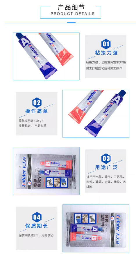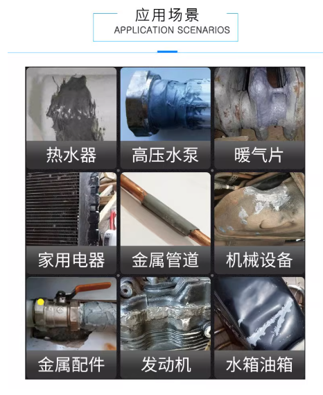 广泛的应用领域:除金属外,还可用于塑料、陶瓷、玻璃、木材、石材等材料的自粘或互粘,具体应用包括汽车维修、电子组装、建筑装修、家具制作、工艺品固定及家庭日常修补等。
