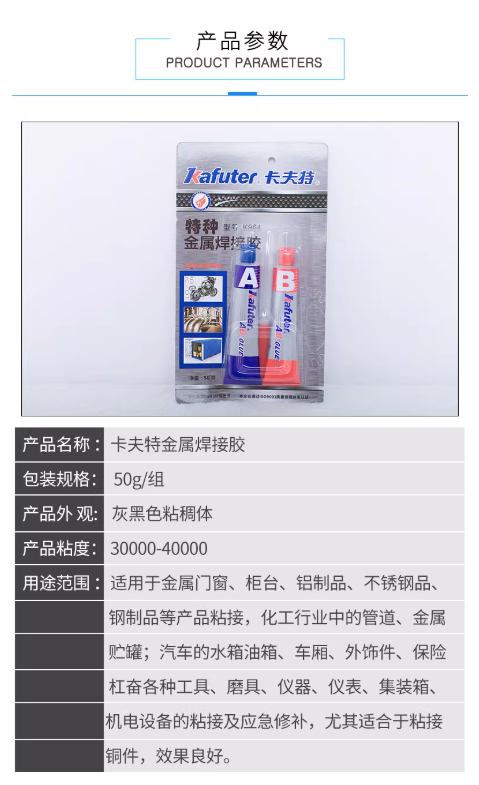 需要注意的是,该产品为环氧树脂胶,而卡夫特品牌下还有其他型号(如K-8810W)属于丙烯酸酯胶黏剂,性能略有差异,但K964型号的作用是提供强调、耐环境的结构粘接。